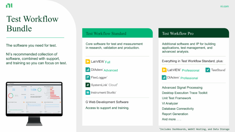 Test Workflow melengkapi engineer dengan aplikasi yang spesifik sehingga mereka dapat memilih yang tepat untuk pekerjaannya—dari graphical programming environments hingga aplikasi perangkat lunak tanpa kode dan interaktif. Engineer menggunakan software Test Workflow untuk melakukan ad-hoc tests, membuat automated test system, automate data analysis and reporting, develop test sequences dan banyak lagi lainnya. Mengapa Engineers butuh Test Workflow? Pernyataan Masalah – Test