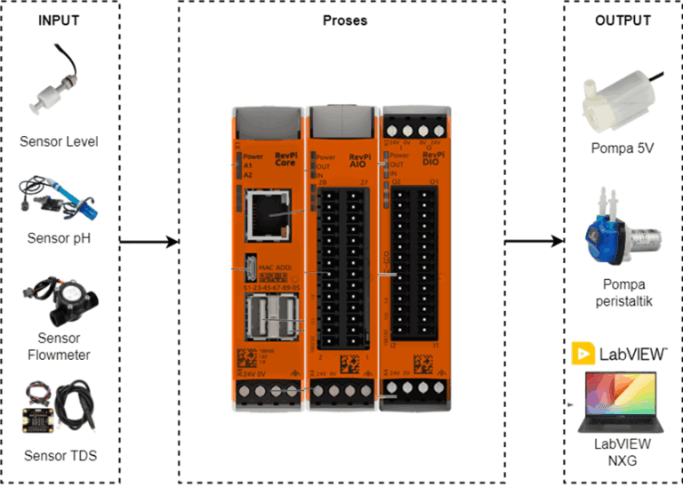 A prototype capable of monitoring pH values and solution concentration/TDS (ppm) in a hydroponic solution. In addition, a control system is included, consisting of a peristaltic pump and a 5V pump. The monitoring data is processed/programmed using Revolution Pi (RevPi Core, RevPi AIO, and RevPi DIO) to run the control system so that the pumps can operate automatically if the