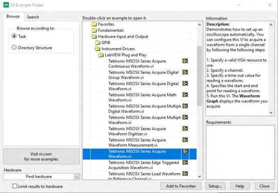 3. From the list of examples, select MSO5X Series Acquire Waveform.vi. Connect the MSO 5 Series oscilloscope through either Ethernet, USB, or GPIB connection.