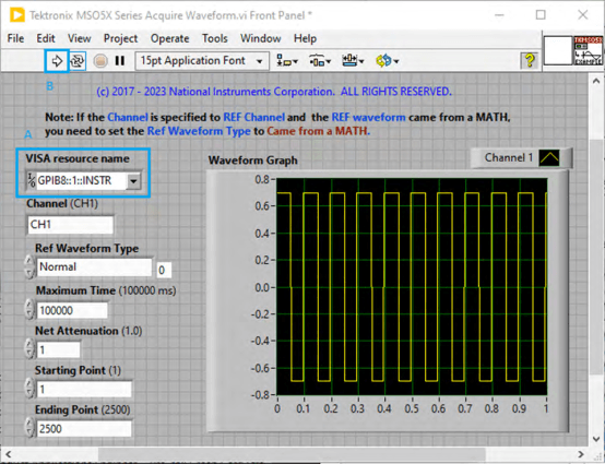 4. Open the example VI which will display the Front Panel. The Front Panel is the User Interface portion of a LabVIEW script, while the source code is referred to as a Block Diagram. Before executing the example, select your instrument in the VISA resource name dropdown and then click on the Run button. The waveform captured from the oscilloscope now populates on the Waveform Graph.