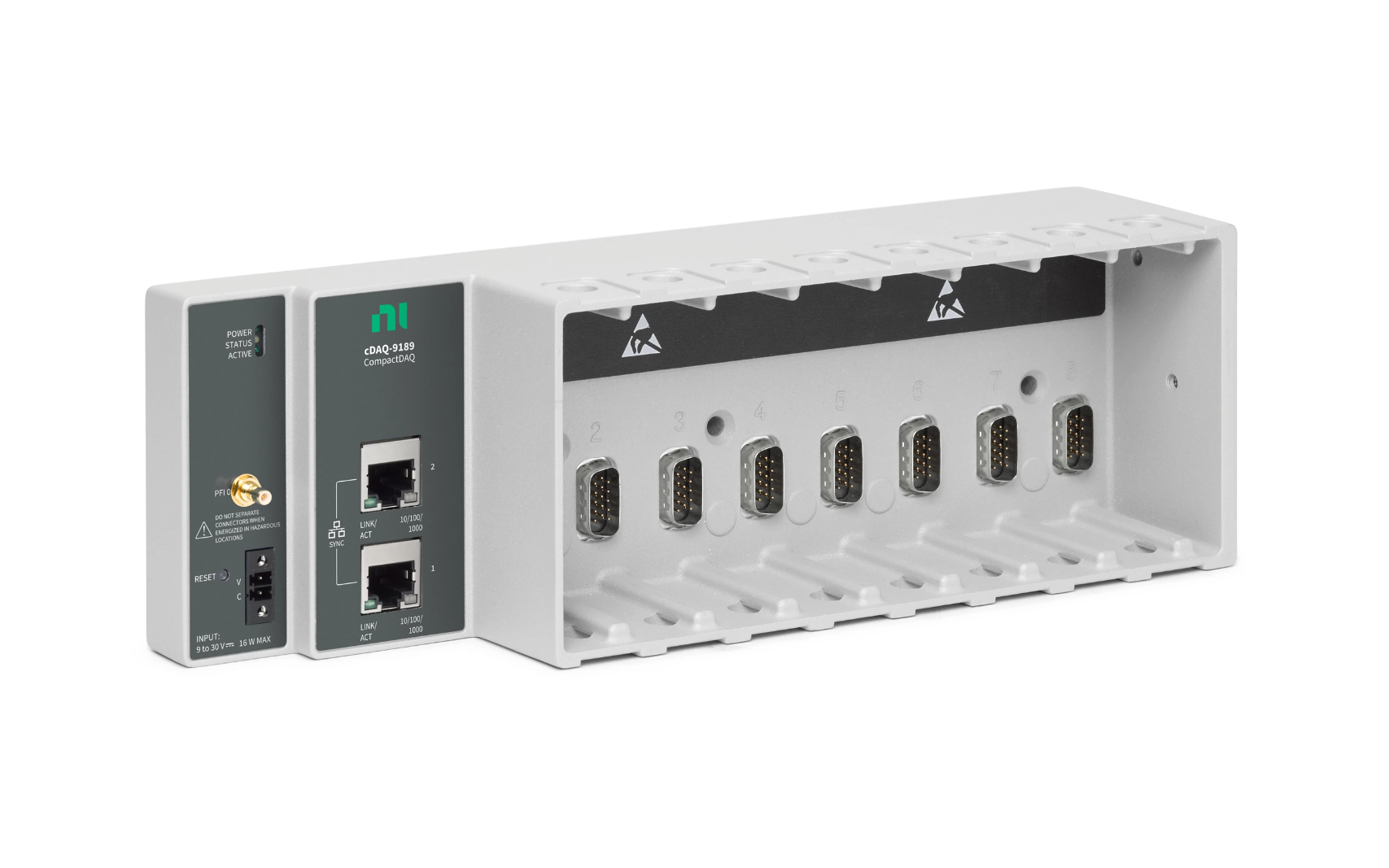 CompactDAQ Chassis control the timing, synchronization, and data transfer between C Series I/O modules and an external host. The chassis feature USB or Ethernet connectivity, and are available in different slot counts for the right amount of I/O.
